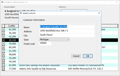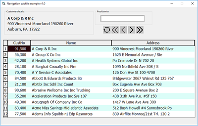 DclSrParm FromRec Type(*INTEGER) LEN(4)Each time a row position is changed the customer info panel at the top left of the screen is refreshed with customer info for the current subfile record. AVR Classic's subfile reports zero-based Row and Col properties, but the subfile RRN is one based. When chaining to the subfile with the subfile Row property, be sure to add one to it to 'translate' it to the corresponding one-based RRN.